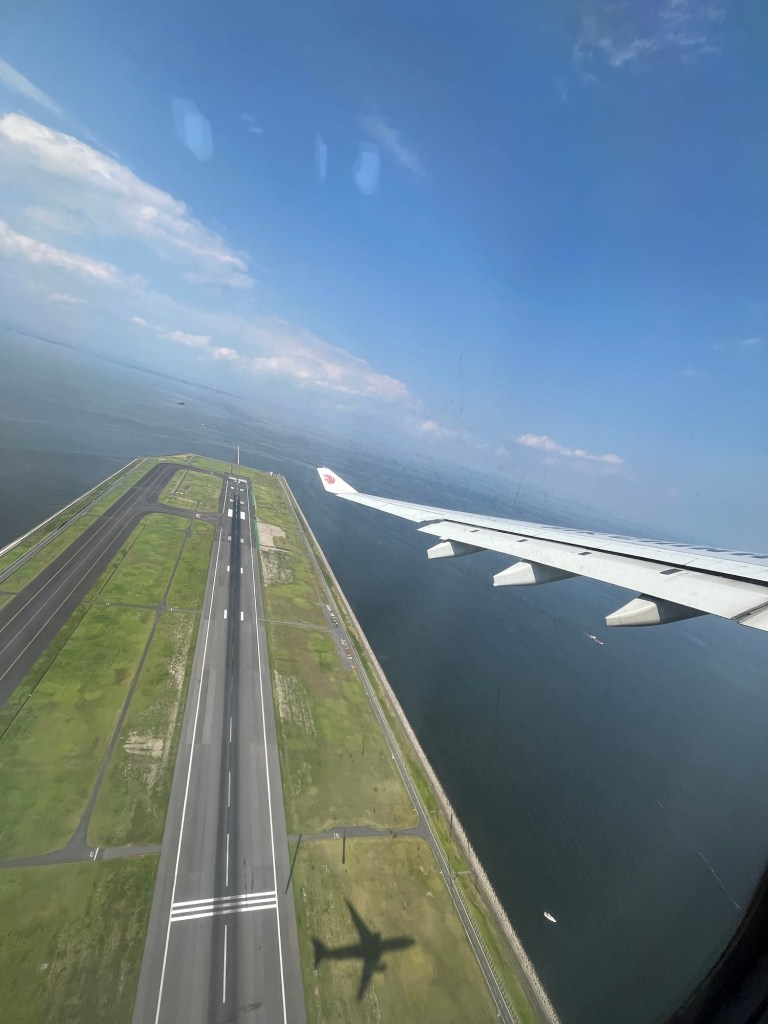 離陸はスムーズ、離陸時、羽田の滑走路がよく見えました。さよなら日本!