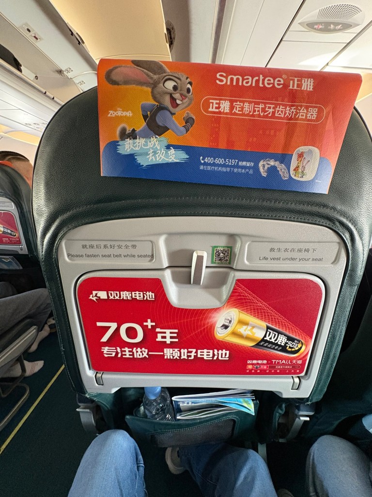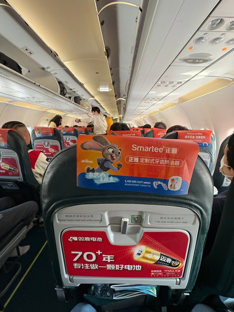 機内はこんな感じ、一般的なLCCとほぼ変わりません。言語は中国語、英語の他、自動音声で日本語も流してくださっていました。